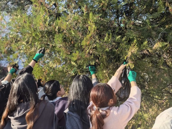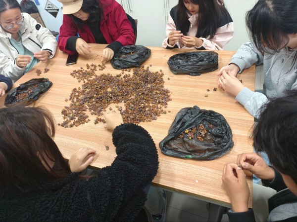 采摘现场,校园内的侧柏枝繁叶茂,柏籽满枝。施溯筠细致讲解侧柏的辨认要点及采摘方式,并提醒同学们注意正确佩戴手套以防划伤。同学们手持花枝剪,在枝叶间细致搜寻、小心采收,以饱满的热情投入采摘工作。同学们在指尖劳作中掌握侧柏子辨识的要点,在淡淡松香中深入理解校园药用植物资源的开发价值,进一步激发了药学探索热情。清洗晾晒环节,同学们对侧柏子进行净制,逐一分拣种子,挑选出饱满的种仁,经清水仔细冲洗后,充分通风干燥。净制后,经过炒制、酒炙等炮制步骤,最终成为具有药效的侧柏子。同学们全程参与中药初加工流程,不仅直观掌握了中药制备的基础技能,更在实践活动中切身感受了传统药学技艺的严谨。
