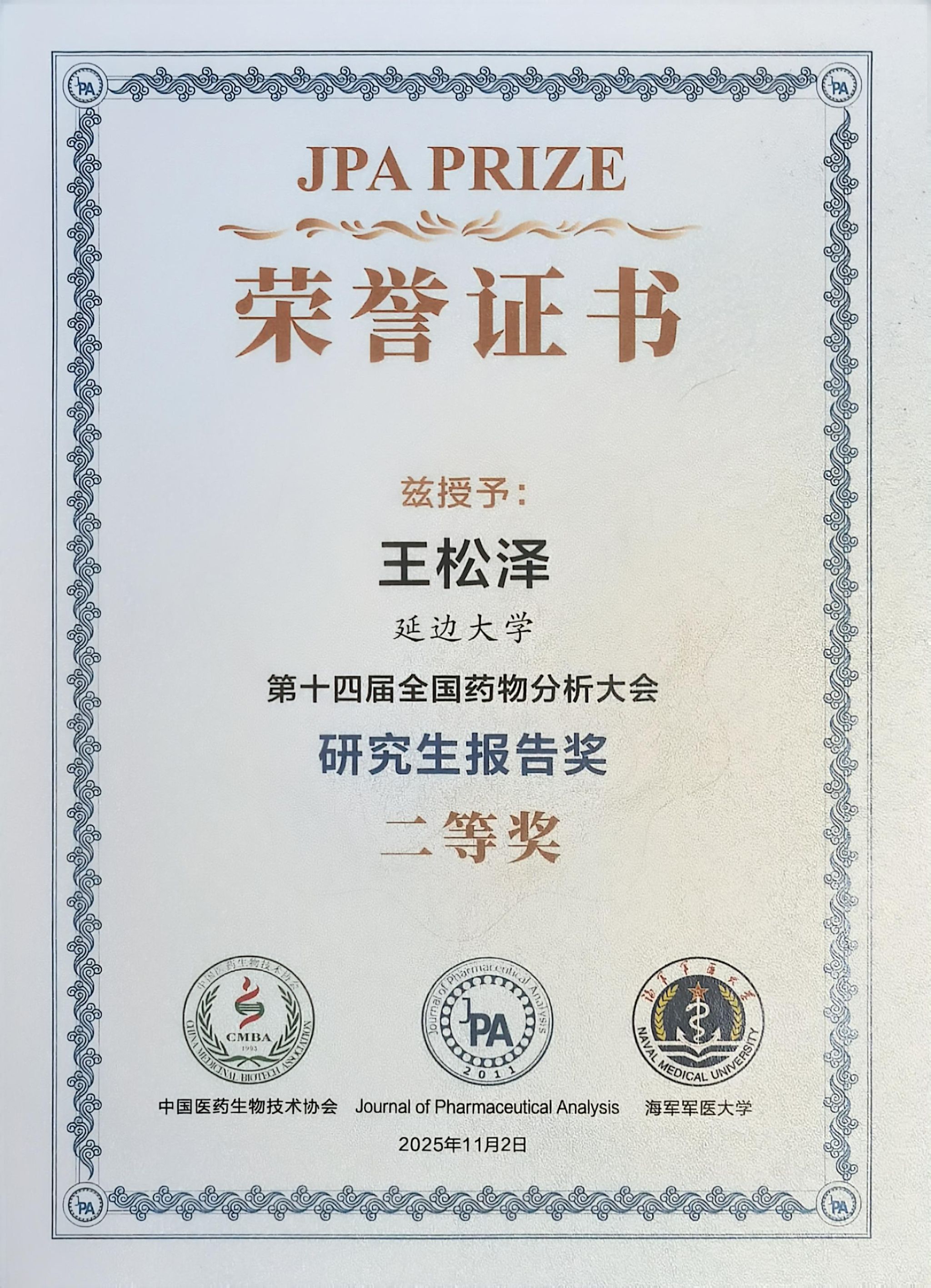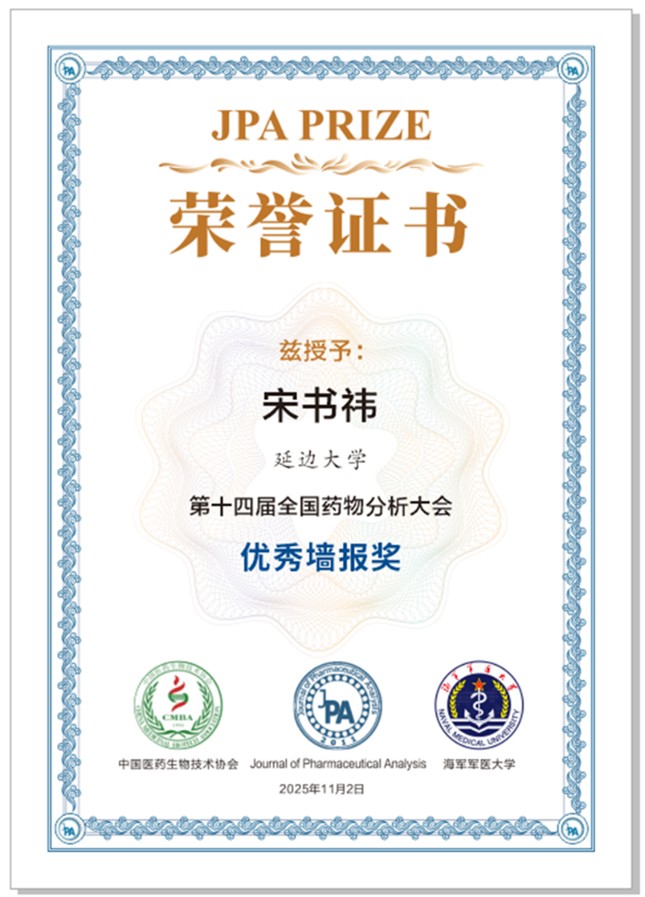 这是闵俊哲教授第12次带领学生参加全国性学术会议并取得奖项,极大地提升了延边大学、延边大学药学院以及药物分析学科在全国性学术舞台上的知名度和影响力,为研究生提供了更为广阔的学术交流平台,促进了学术研究的交叉合作,拓宽了学生们的学术视野,为我校培养优秀的药物分析人才奠定了良好基础。