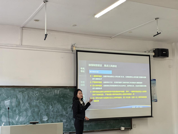 孙金凤围绕“考风考纪、考务规程、应急处理”三个方面对本学期相关工作做了详细部署。她指出,学校出台了《延边大学教风、学风、考风联动建设实施方案》等一系列方案和规定,为考风考纪建设提供了坚实的制度保障。她强调,必须严格执行各项制度,全方位压实命题、监考、阅卷全流程责任,对任何教学事故坚决采取“零容忍”态度。她要求,各教研室要针对命题、监考、评卷等方面存在的问题立即开展自查自纠,做到即查即改,举一反三,希望全体教师切实落实立德树人根本任务,有效推动“三风联动”,扎实推进教学质量提升。