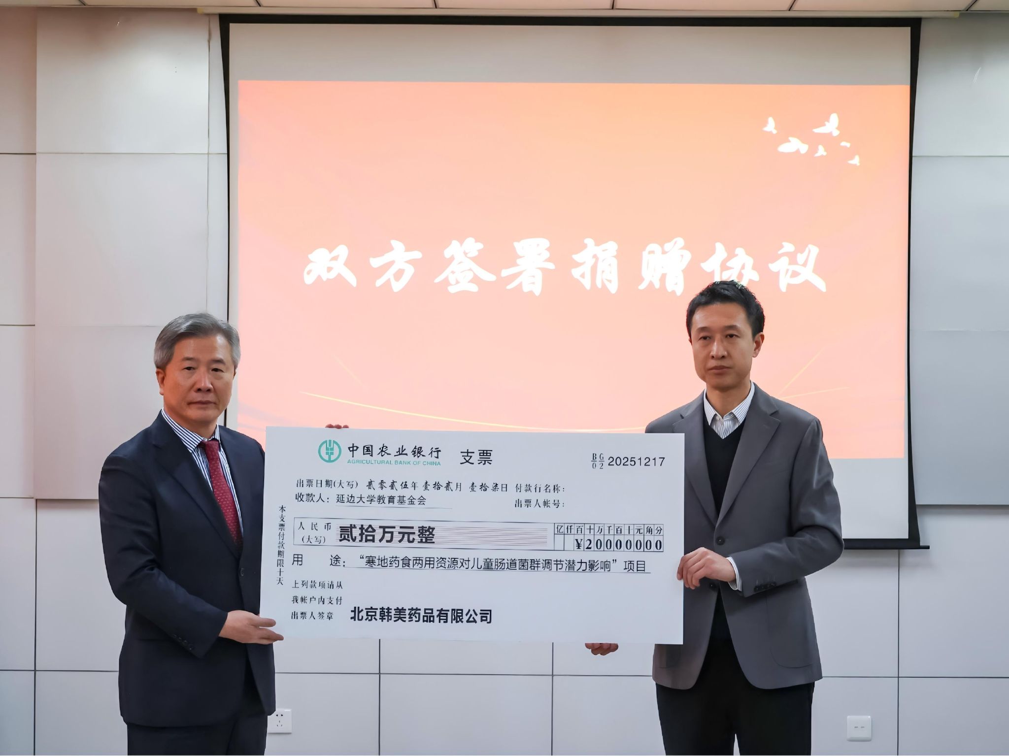 任海龙在致辞中表示,北京韩美药品有限公司始终关注儿童健康与医药科研发展,此次捐赠是企业履行社会责任、推动产学研结合的重要举措。多年来,延边大学为企业输送了大量高质量的医药人才,不断为企业发展注入新的活力。希望通过基金的设立,为延边大学在寒地药食资源与儿童肠道菌群研究领域提供支持,共同促进边疆医药事业发展。