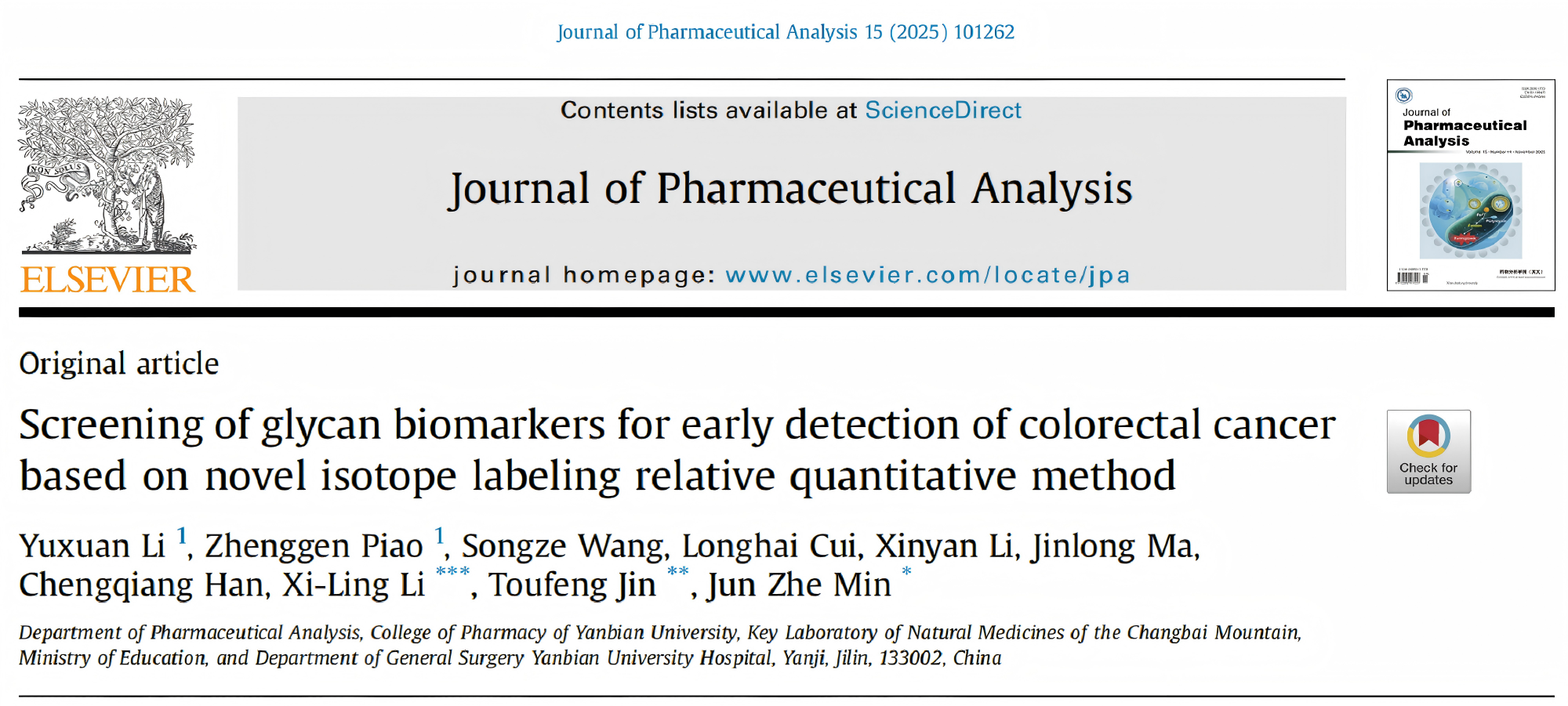 近期,延边大学药学院教授闵俊哲、副教授李喜玲与延边大学附属医院胃肠外科金头峰主任合作,成功在药物分析领域Top期刊《Journal of Pharmaceutical Analysis》(影响因子 8.9,位于全球药理学和药学类学术期刊前4%。中国科学院1区。)上发表论文,题目为:“Screening of glycan biomarkers for early detection of colorectal cancer based on novel isotope labeling relative quantitative method”。