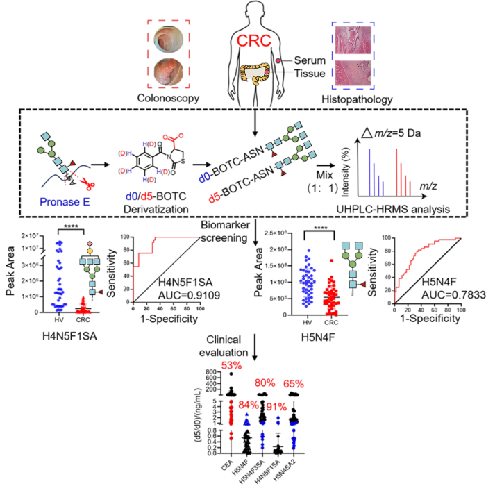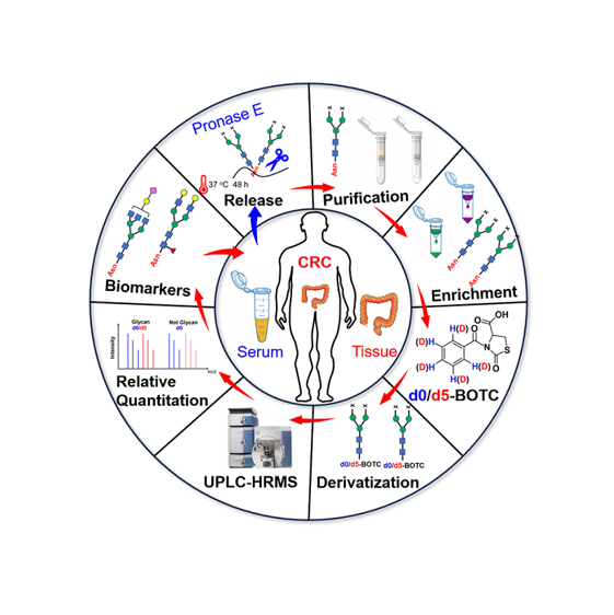 本研究针对结直肠癌早期诊断生物标志物缺乏、传统肿瘤生物标志物CEA与CA19-9灵敏度低和准确性差而导致患者错失治疗窗口的临床痛点,创新性地开发了基于同位素质谱探针d0/d5-BOTC标记的聚糖相对定量分析UHPLC-HRMS新方法,对结直肠癌Ⅱ期患者和Ⅲ期患者的血清与组织样本中差异性表达的聚糖进行了筛查。首次鉴定出H4N5F1SA、H5N4F、H5N4F3SA和H5N4SA2四种N-聚糖在Ⅱ期和Ⅲ期结直肠癌患者血清中呈现显著差异表达。其中H4N5F1SA的诊断阳性检测率高达90%,诊断效能显著优于传统肿瘤标志物。该成果为结直肠癌的早期筛查与病情监测提供了新型潜在生物标志物与全新策略,具有重要的临床应用转化价值。