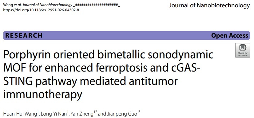 近日,药学院药物制剂教学科研团队郭建鹏教授课题组在Top期刊《Journal of Nanobiotechnology》上发表了题为“Porphyrin oriented bimetallic sonodynamic MOF for enhanced ferroptosis and cGAS-STING pathway mediated antitumor immunotherapy”的论文,博士生王焕辉为第一作者。